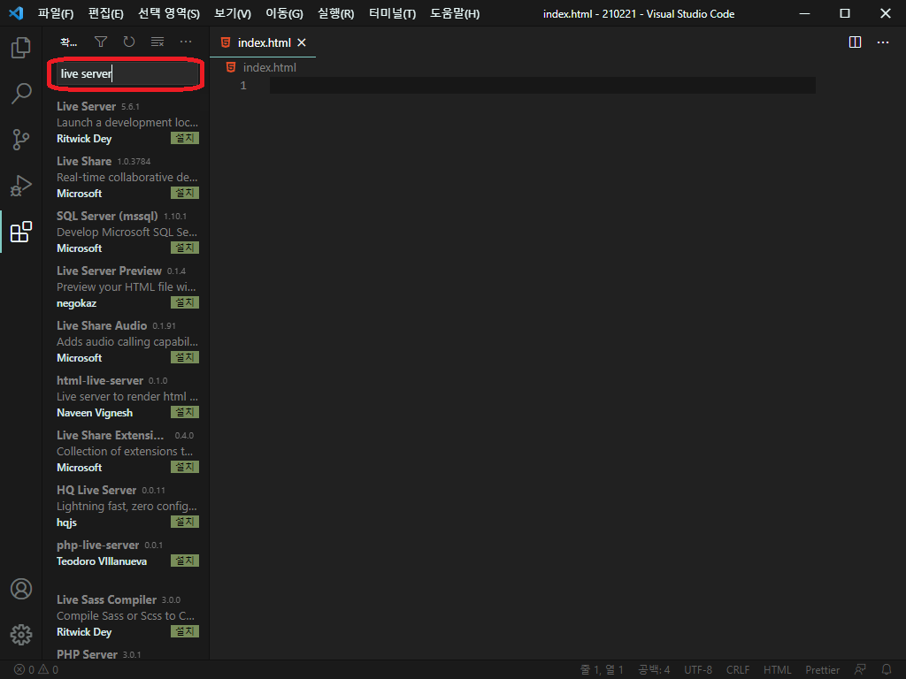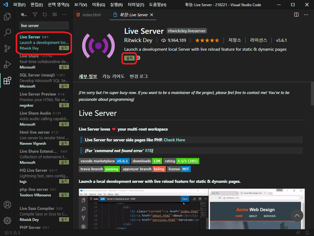 설치하고 나서 실행하고자 하는 웹코드 파일에서