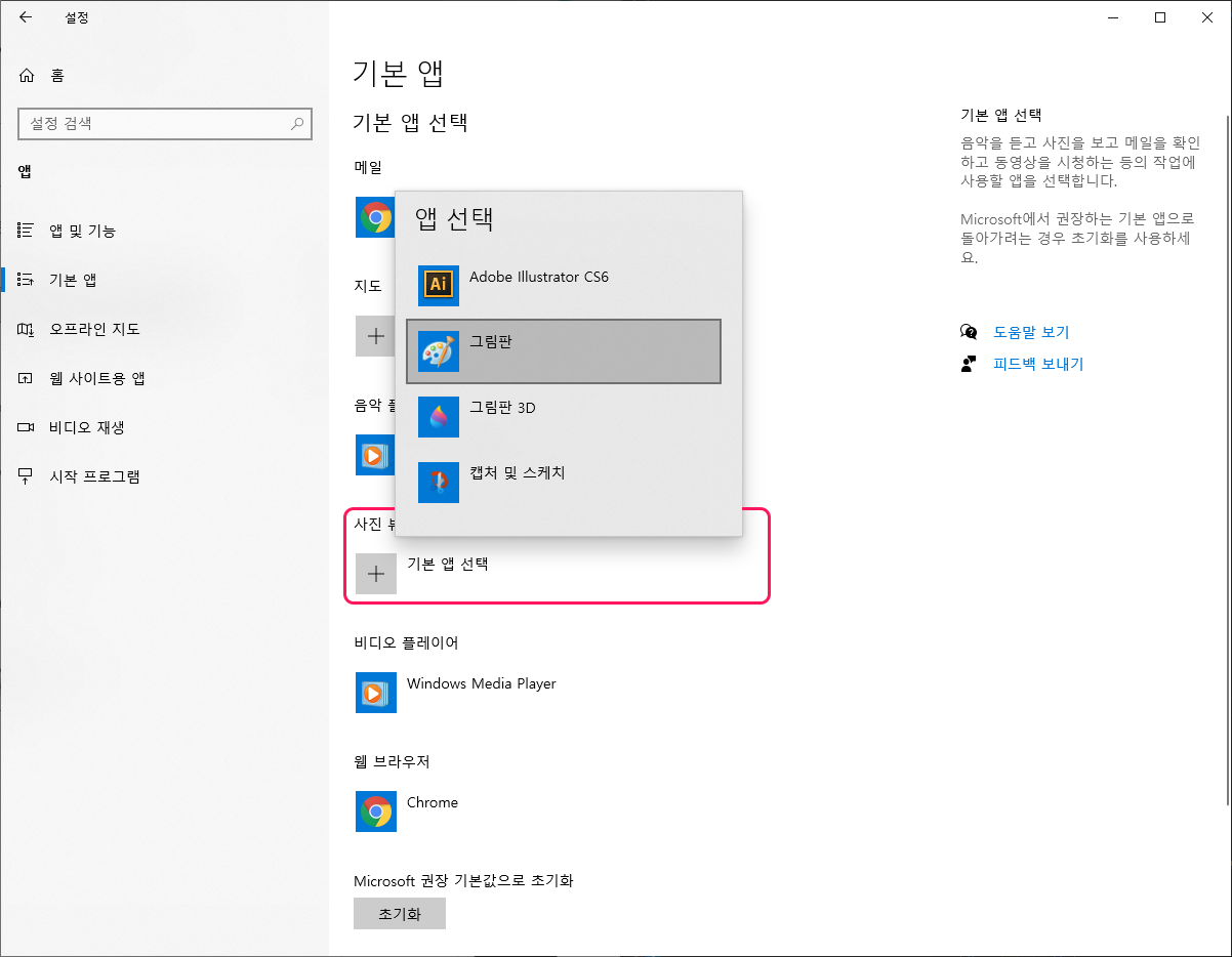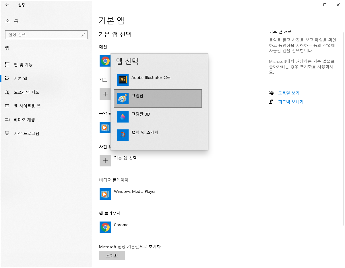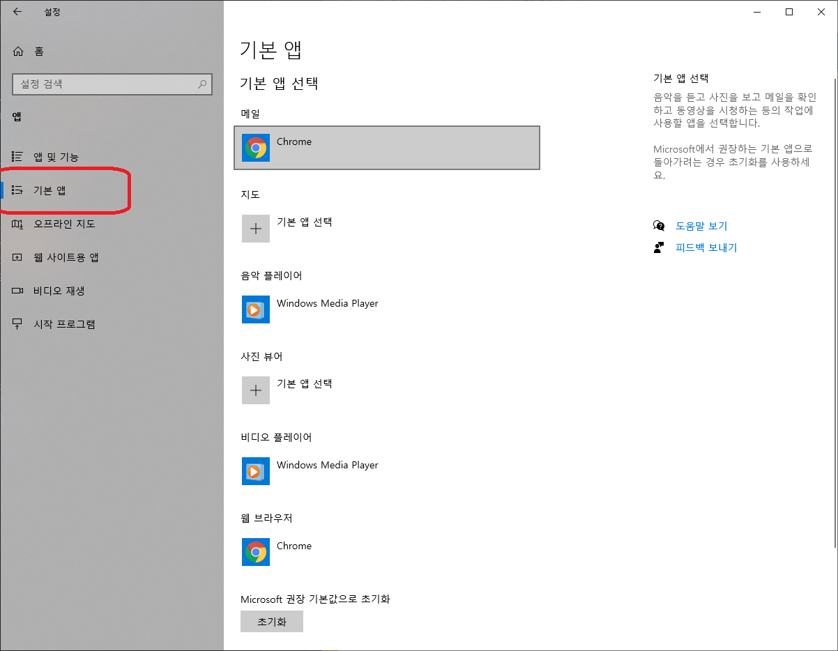 왼쪽 메뉴에서 기본 앱을 눌러준다.